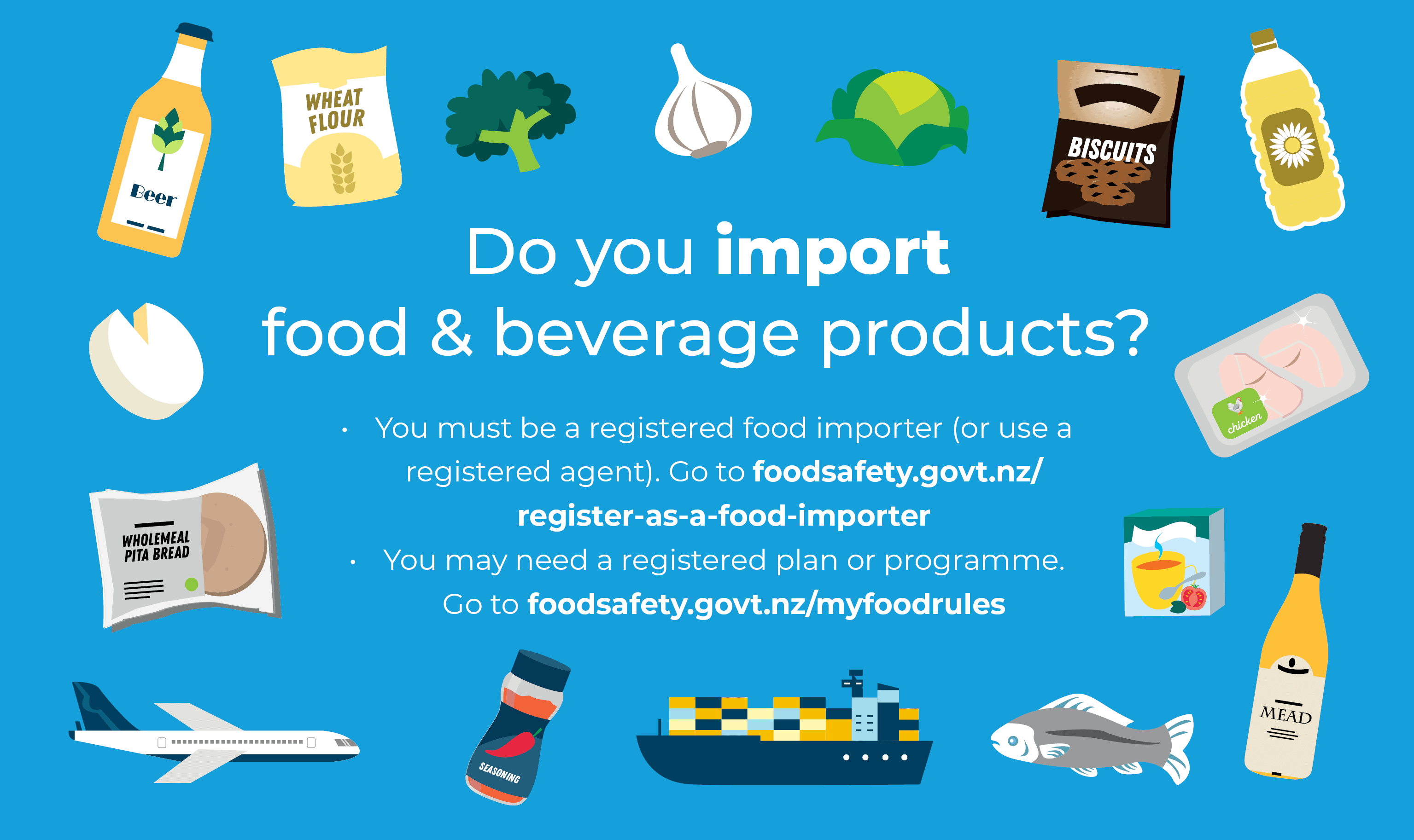 If you import food, drinks, or ingredients for sale (including goods for further processing or re-export), you must be registered as a food importer with New Zealand Food Safety (part of the Ministry for Primary Industries). Alternatively, you can use an agent who is registered to import your food for you.